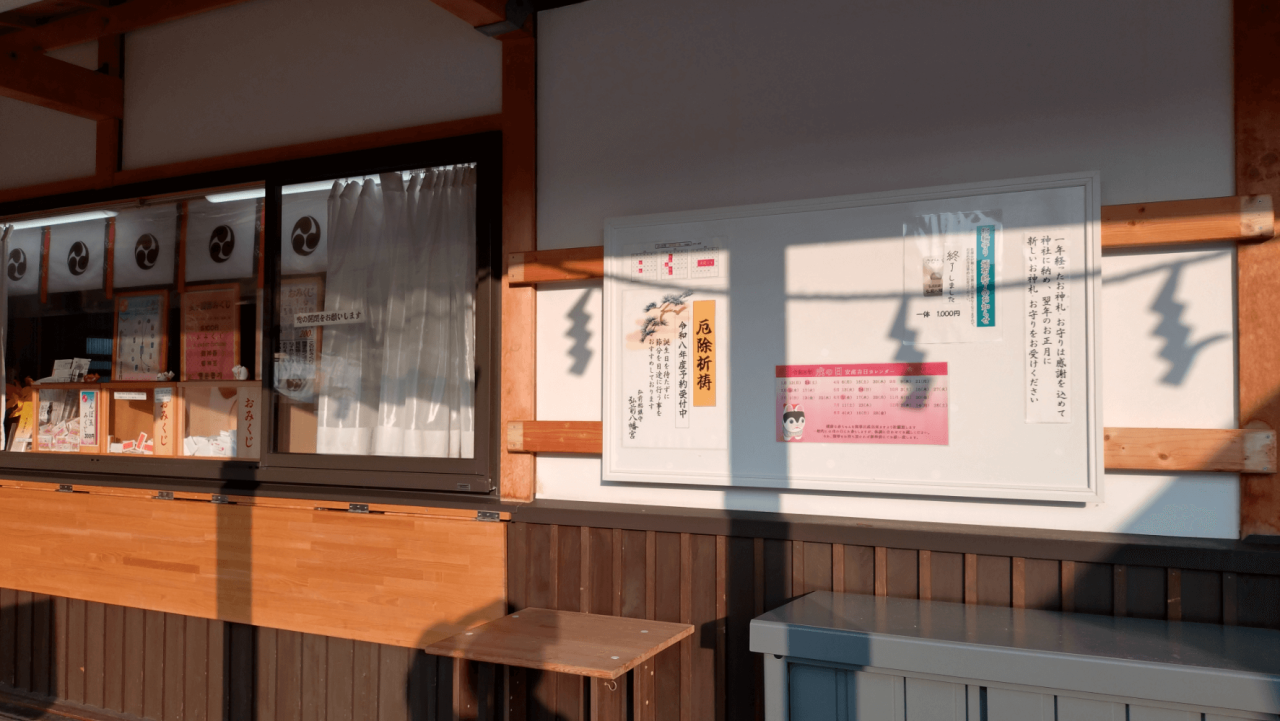 新しい掲示板は、おみくじ授与所の右側に設置されました。これまで同様、休所日やお知らせなどを掲示して参りますのでどうぞご覧ください。